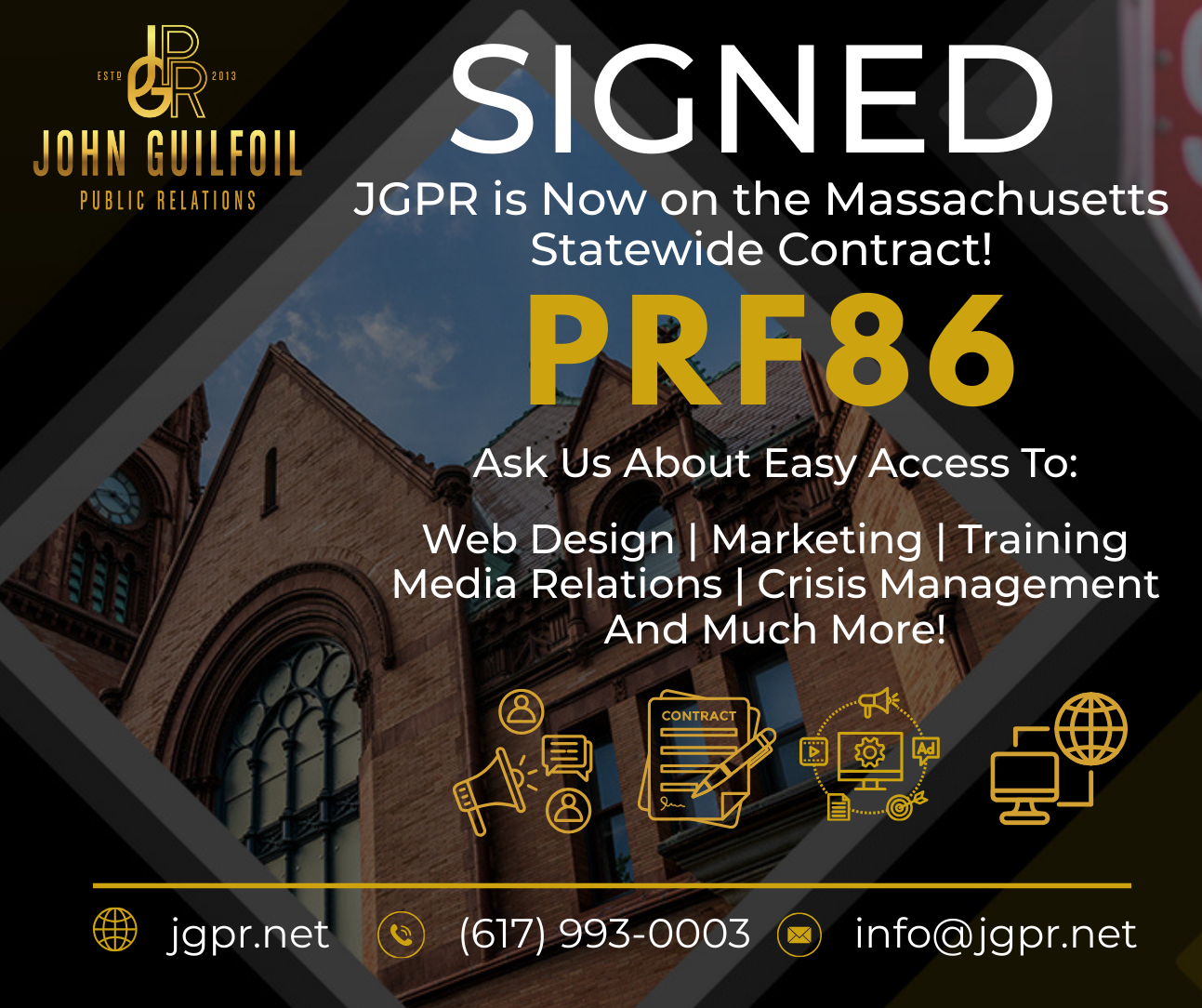 GROVELAND – John Guilfoil Public Relations (JGPR) is proud to announce that the company has been signed to the Commonwealth of Massachusetts Statewide Contract PRF86: Advertising, Marketing & Event Planning Services.